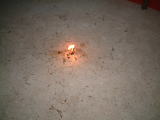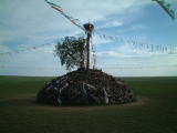 パオの敷地の中にはラマ教の礼拝場があり、積み上げられた石にお布施をはさみ込み、左回りに三回周回して祈った。しかし、白ガイドが言ったこの左回りというのはどうやら怪しくて、その後現地の人達が右回りに回っていたことからすると、間違いであったかもしれない。今日は内モンゴル自治区の厚生大臣がこの地を訪れるとあって、夕食は彼らの到着まで待たされ、それも到着が遅れたため、我々は草原に寝そべり、妻はその気持ちよさに本格的に寝入ってしまう始末であった。やがて陽も西に傾いたころ、バスと乗用車を連ねて政府役人達が到着、イベント会場で歓迎のセレモニーが行われたようであったが、我々は夕食をとるためにレストランに入った。そして夕食が終わった頃は既に外は陽も落ちかけてほの暗くなっていた。パオに戻り扉を閉めると中は暗く、早速蝋燭を立てて灯をともし、それも二本を同時につけて明るくした。平原の日没は遅く、いつまでも空の明るさが残っていたが、20時を廻る頃から星が一つ二つと輝きだし、そのうちに広場で火祭りの宴が始まった。闇の中にオレンジ色の炎が揺れ、その回りを赤い衣裳を着けたレストランの従業員と役人が輪になり、時には組み合って踊り回る。音楽は軽快な民族曲。周辺を取り巻いて見つめる人の輪を赤い火が反射する。一時間以上も続いた火祭りは螢の光の曲で終宴。火が消され人々はその場を去っていった。役人達はパオには泊まらずそのまま帰っていったため、今宵の宿泊者は我々の一行のみとなった。火が消えると空は満天の星の輝きに覆われていた。漆黒の闇にきらめく星々。我々は地面に寝ころび、ロマンの世界を堪能する。流れ星が横切り、人工衛星がゆっくりと星の間を縫っていく。