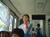 パオの1日は最後にレストランの従業員も含め全員で記念写真を撮って終わったが、集合写真を撮ったあとも赤い衣裳の女の子たちをポラロイドカメラで撮ってはプレゼントするという交流が続き、あまりにも女の子たちが群がるのでレストランの店主が「早く仕事に戻れ」と怒鳴る場面もあった。因み写真好きの中国人にはこのポラロイドがいつも人気で、どこのレストランや土産物屋でも少年・少女を撮ってあげると喜ばれており、辺境の旅にはこういうものが良いのだと旅の必需品を教わったような気がした。陽が高くなり強い日差しが日陰のない草原を照らす頃、我々はバスに乗り込み出発しようとしたが、ガイドの白さんの姿がない。待つこと10数分、ようやく姿を現した彼がバスに近づいてくる頃合いを見計らって運転手はバスを発進させ、あわてて追ってくる白さんを尻目に周辺を2周・3周。車内爆笑の一場面であった。
