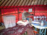 パオは常に移動するからいつも同じ場所にあるとは限らない。そのパオも当然今そこにあるだけなのだろうが、意外に小綺麗な造りで、パオの前には馬が一頭、犬が一匹いて、羊の骨や毛が散乱していた。住人は男性が2名、期待した子供の姿は見られなかった。パオの中を見せてくれたが、床は草原のまま、ベッドにテーブルがあり、壁には真新しい掛け時計が置かれていて、綺麗に片づけられていたのが印象的であった。口数の余り多くないパオの主は持参した土産に興味を持ったらしく、我々が手を振って別れる挨拶をしても知らんぷりで土産をのぞき込んでいた。