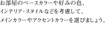 検索によってこのページに来られた方は、トップページからご覧ください。![]() ![]() ![]() 全体のスタイルが決まったら、家具やファブリック、インテリア小物などの色や質感を決めるカラー・プランの必要があります。同系色でまとめたり、類似する色調などで統一感を演出します。あまり同系色ばかりでまとめると変化が乏しくなる場合がありますので、アクセントカラーをうまく取り入れて変化を付けましょう。暗い色はなるべく下に、明るい色が上にくるように配置すると、安定感のある配色になります。 当サイトでは色分けをベースカラー、メインカラー、アクセントカラーとして分けています。(人によってはベースカラー、サブカラー、アクセントカラーまたはベースカラー、テーマカラー、アクセントカラーなどと表現されていますが内容は同じだと思います。分譲住宅などでは床や建具などのベースになる色を選べない場合もありますので、ご本人が選びたい好みの色という意味も込めて、ここでは「メインカラー」を採用させていただきました) ベースカラー部屋全体の約70%を占める色です。白系の壁紙や天井の場合は床や建具の色がベースカラーになりますが、色味のある壁紙や天井がベースカラーになる場合もあります。家具などを配置する場合、木製部分をベースカラーに揃えると配色がシンプルにまとまりますが、同系色で明度差があっても統一感が保てるでしょう。しかしチェストやテーブルやチェアなどの木の部分はできるだけ色を揃えておきたいものです。 壁や床など白で統一された部屋では白をベースカラーとして扱っても良いように思いますが、大きい家具やファブリックの色をベースカラーとしても良いでしょう。ベースカラーには大勢が集まるリビングなどではあまり派手な色は疲れそうです。壁紙は色味の少し入ったオフホワイトやベージュなどクセのない色が一般的。子供部屋やベッドルーム、トイレなどはいくらか派手目の色で演出しても良さそうですね。 一般の分譲住宅などでは床や建具の色は茶系統から薄黄系統が多いのではないでしょうか?あまりグリーンだったり紫だったりすることは稀なようです。メインカラーを選ぶ場合このベースカラーに対して馴染みの良い色を選ぶ必要があります。家具を購入する場合、家具屋さんの店頭で見た目だけで選んでしまうと自宅のベースカラーと合わない場合があるかもしれません。 メインカラー(サブカラー)部屋全体の約25%ほどの色で、ソファーやカーテン、ラグなどのファブリック類で演出します。ベースカラーに対して違和感のない色調ならば同系色や類似色だけでは なく反対色(補色)を選んでも良さそうです。できれば同じタイミングで購入して同色同デザインの家具を揃えるのがベストですが、後から追加する場合でも同色同デザインを意識して選んだ方が部屋の統一感は保てます。色を選ぶにあたっては好みの色を優先したほうが良さそうです。色には様々な心理的な効果がありますが、理屈よりも好みを優先することをお勧めします。 アクセントカラー部屋全体の約5%ほどの色。全体の色調に対して小面積の反対要素の強い色。小物類、クッションなどで全体を引き締めましょう。 下図は一般的な色相環の例ですが小学校で使っていたクレヨンや水彩絵具と基本は同じです。デザイナーなどが使う色相環にはいくつかの種類がありますが、区分けの仕方が若干違うだけです。自然界で見られる虹色ともいくらか違います。色の属性として色相・明度・彩度で表現しますが、あまり神経質に考えることはないでしょう。 一般に家具や家電製品などでは売れ筋の色のみを揃えていたり、パステルトーンやナチュラルトーンのように抽象的な色分けをしている製品が多いようです。ですから好みの色で揃えようと思っていても思い通りの製品が存在しないかもしれません。ただ目安として暖色系にするのか寒色系にするのか、あるいはグリーン系や紫系の中性色で統一するかなど大まかに決めた方が良いかも知れません。おおよその色相が決まればあとは、重厚なイメージにしたいのか軽いイメージにしたいのかなどを彩度と明度を使って決めます。 ![]() 下図では明度・彩度によりトーン(色調)が種類分けされていますが、これはどちらかというと商品開発者の為の種類分けだと思います。ユニクロなどではかなり細かく商品の色分けをしていますが家具メーカーやファブリックメーカーでこのように細かく商品を揃えているところは少ないようです(※現在クロスカバーなどで100種ほど揃えているメーカーがありました)。こんな中から好みの色を探し出してもぴったりの商品が売られているとは限りませんので、大雑把に好みの色を決めたほうがよいように思います。 ![]() とりあえず色分けされた商品があったとしたら下図のようなことになるのでしょうか?たぶん家具メーカーをあたってみてもこんなに色の種類を揃えているところ