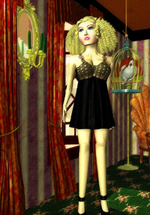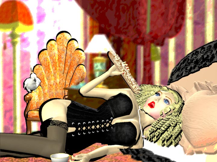 キャミソールのLulu 絵のサイズを大きくしました。あと、フィルタをかけました。 画面の外の形状を全部削除したら、すぐにレンダリングが終わりました。 |