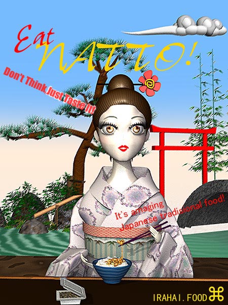 Maiko(Eat Natto!) これは、十数年前、アメリカの食品会社のイラハイ社が納豆を売り出すべく社運をかけた大キャンペーンをはったときに作られたポスターです。・・・という設定。 舞妓さんだからMaikoなわけね。 |