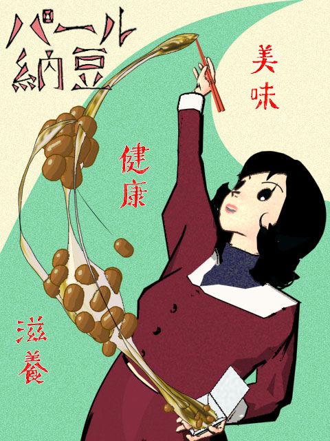 パール納豆宣伝ポスター 昭和モダン風に。字は手書き。 女の子の名前は納谷トウコ。次回作の主役の予定。 MAXのInk'n Paint使用。 |