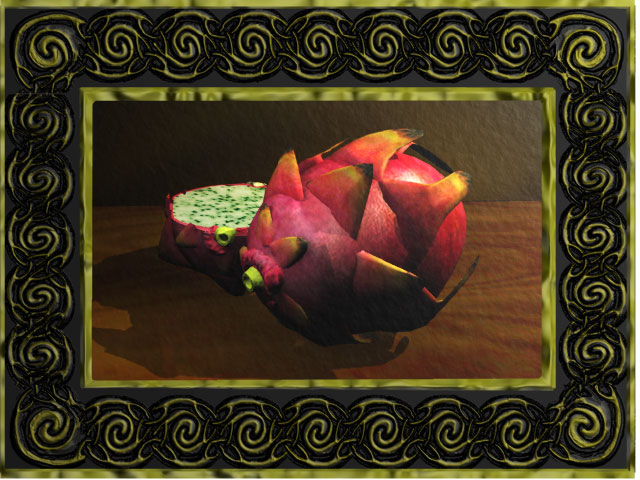 ドラゴンフルーツ 沖縄物産展で買ったドラゴンフルーツという果物です。 形が面白いので作ってみました。が、それだけではいまいちだったので、額に入れて飾ってみました。 味は、キーウイの食感の洋なし。 |