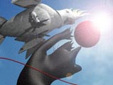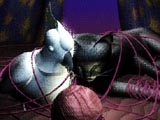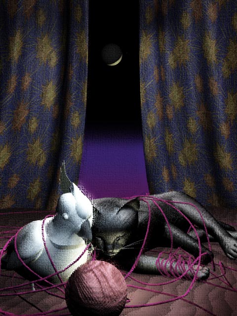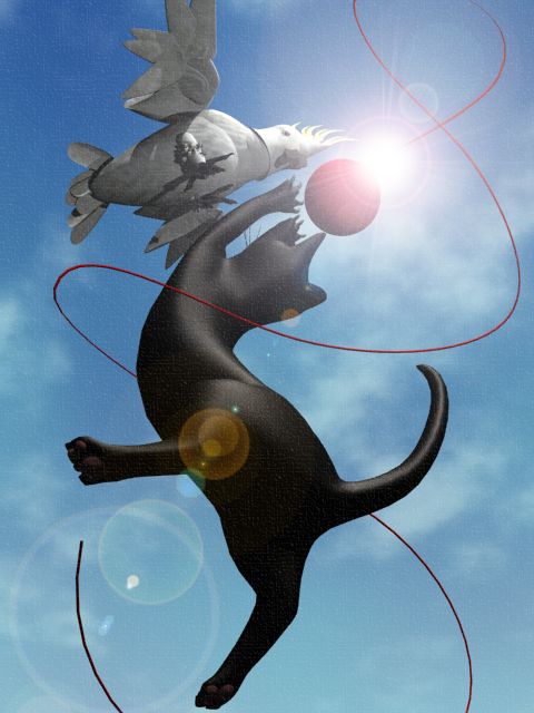 エルビスとクロ(昼) そいるさんとのコラボレ作品。そいるさんのメタセコで作った黒猫、クロと私のオウム、エルビスの共演・・・っつーか、毛糸玉の奪い合いです。 レンダリングはそいるさんがShadeでやりました。 |