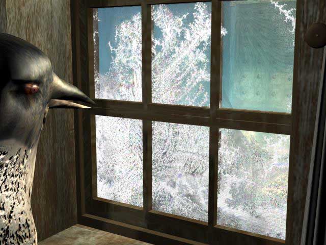 窓霜を見るペンギンのお医者さん 「ペンギンのお医者さん」の1シーンを抜き出しました。MAXです。 小さい絵だとよく見えないシーンだったので。 霜はフラクタル作成ソフトでテクスチャを作りました。 |
