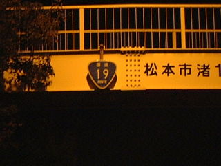 松本市から長野市方面を結ぶ国道。松本ICで高速を降りて、ほどなく19号に入り、標識もかなり多く存在しているが、撮影はかなり難航。交通量多い上に路肩が無い(左側は河川)道路なので、停止できるポイントが少ない。松本から豊科に入ってしまったので、いったん引き返したところ、ある程度の道幅の道路で横断歩道上に標識があるのを発見。照明も明るかったので夜の割にはフラッシュ無しでもくっきり撮影できました。