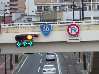 駅前から市電に乗り、起点である大雲寺交差点を経て、清輝橋(終点)で下車。ここから徒歩で攻めるつもりでいたが、下車してすぐの交差点(清輝橋交差点)にかかる歩道橋に標識を発見。対面側だったので、危うく見逃すところでした。ところで、撮影した標識は「30」という数字を上から塗ったように見受けられます。過去にはこの区間は国道2号との重複区間だったこともあったようなので、「2」を塗り直したのかもしれません。