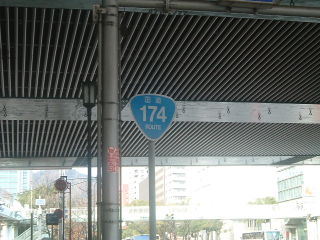 日本一短い国道として超有名。三宮駅から港の方向に向かって歩き、「税関前」交差点に出る。ここが国道2号から174号が分岐する交差点。そして高架下を過ぎたところで174号はおしまい。その全長はおよそ187m。こんな短い国道ですが、「日本一短い国道」という内容の看板があり、標識も両方向に1個ずつあるサービス精神がうれしい。