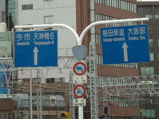 阪急梅田駅の前の道を徒歩で北上。まさに176号を歩いているのだが標識がない。176号が大きく左にカーブするが、そのまま歩き続ける。やがて反対側車線が高架になるところに差し掛かる。高架への分岐点に標識を発見。でも古ぼけているなあ。