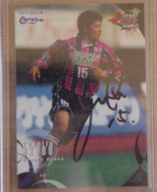 放出不可 J2001-2 大久保直筆サイン 実はこのシリーズはピクシーのジャージが欲しくて結構ボックス買ったのですが、未だお目にかかれず。 かわりに直筆サインが3枚程度出ました。ほかの2人は、手放したのですが、大久保選手は以前から好きな選手なので、今のところ手放す予定はないです。まあゾラやピクシーのそれなりのものとならOKですけどね! |