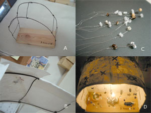 廃材にワイヤーでアーチを作り(A) 和紙で巻き付けました(B)。