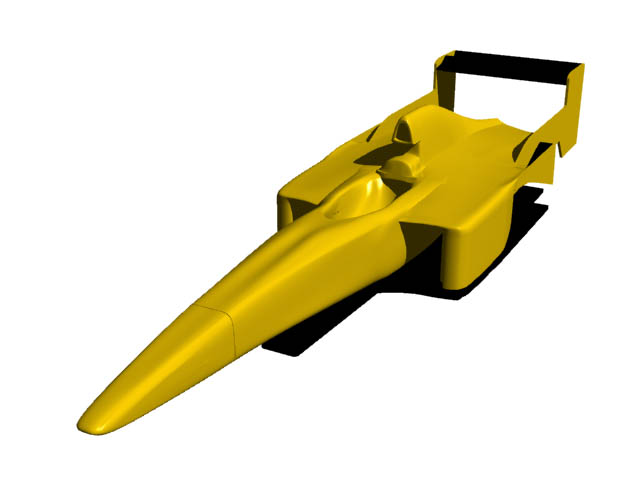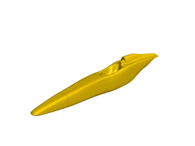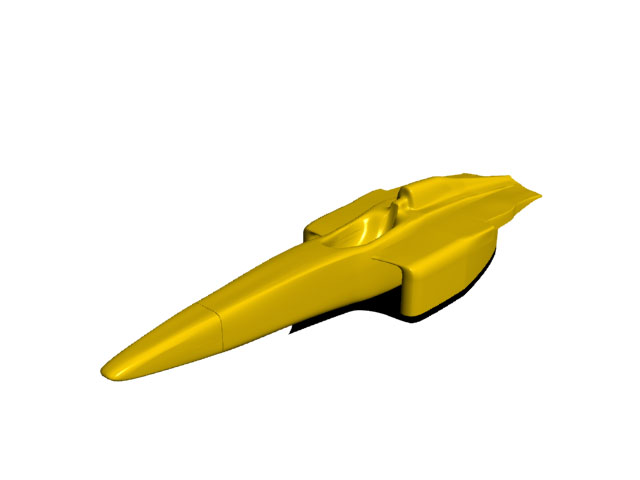 メインボディ。良く見るとフロントノーズとわかれていることがわかるはず。これはテクスチャ貼りつけ時にバンプマッピングでこの溝を表現すると消えてしまうことがあるための処置。また、フロントにはしわが集まりやすい為、製作方法がコクピット部分とは多少違う。(コクピットがZ軸掃引なのに対しフロントノーズはX軸掃引。)