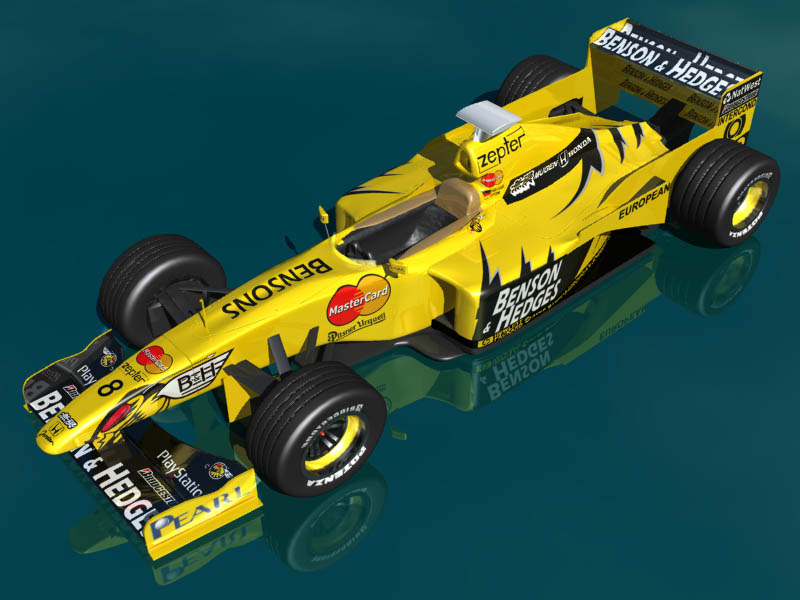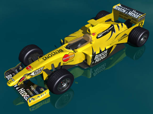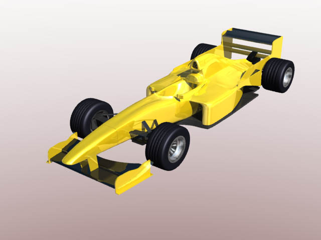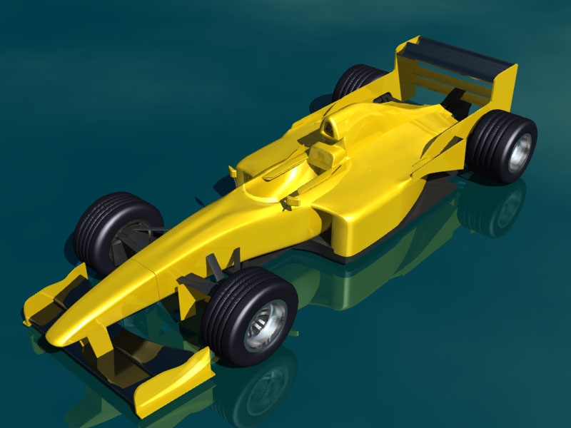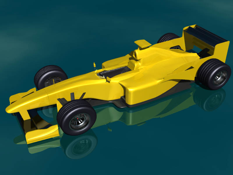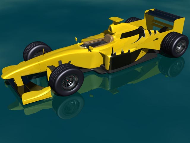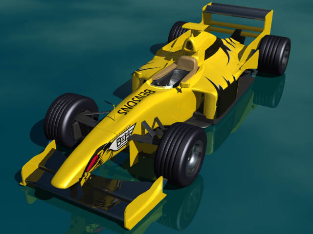 とりあえず多少進歩。ホイルベースが少しばかり長かったのを短くし、ヘッドレストからコクピットまわりにかけての形状を変形。ディフレクターもつけた。あと、F1のボディはどうやら一般車のそれより反射率&メタリック率が低いみたいなのでそこらへんを修正。シートとハンドルが無いとコクピットがなにかマヌケ(^^;