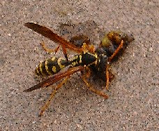 ![]() B 近くで様子をうかがいながら 何度かアタックして あっけなくアシナガバチの勝利となりました 夢中でエサをむさぼるアシナガバチ! その傍らでカマちゃんは 「まぁ、いっか!」ってカンジで カマをナメナメしてましたよ・・・ 寛大なカマキリですね! |