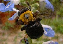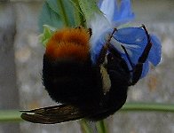 | ガクのところに長い口をつっこんで蜜を吸います | 後ろ足のオレンジ色の玉は集めた花粉です | クロマルハナバチの特長は真っ黒い体にオレンジ色のお尻を持っています |