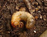 夏に成虫のコガネムシが土に潜り産卵して卵が孵ります その幼虫は植物の根を食べて大きくなり土中で蛹になり越冬します そしてまた成虫となり・・・・ それの餌食になった鉢植えの植物は不幸なことに枯れてしまうでしょう 地にもいますが鉢より被害はマシです 例えその被害に気づいたとしてもその時は既に根がほとんどない状態です 早急な対処が必要です!! 幼虫被害が出始めるのは9月の後半ころからです その頃、少し変だな〜と思ったらまずコガネムシを疑ってください |