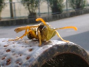| 11月中旬の暖かい日に見かけたオスのアシナガバチ・・・顔面が真っ黄色が特長です。 カラダを暖めているのでしょうか?! 熱を持ちそうな黒い金属やコンクリートブロックに好んで寄って来てはカラダをベタ〜とくっつけます。 |