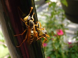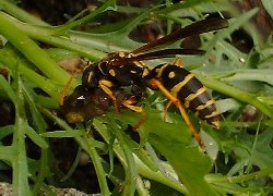 フタモンアシナガバチ スズメバチと共に狩りをするハチ(狩りバチ)の面ではもっとも進化したハチ! 子育てをするため攻撃的・・・ 虫ながら、子どもを育てるという行動はスゴイですね〜 |
