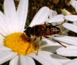 ![]() ハナアブです。 花粉を食べにやって来ます。 雰囲気は「ハチ」なんですが 「アブ」の仲間です。 刺しません。 「ハチ」との見分け方は 大きな「ハエ」のような目、短い触角・・・ これがポイントです。 |