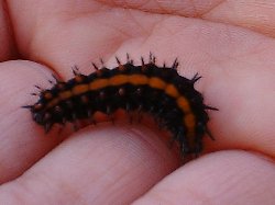 ツマグロヒョウモン(蝶)の幼虫です。パンジー、ビオラなどのスミレ類を食べて大きくなります。 観賞花を食べるので害虫と言われても 仕方ないですが・・・親の姿を知っているだけに 殺すことを躊躇ってしまいます。 今年は大目に見ています(^^ゞ 娘が触りたい♪と手に乗せました・・・(写真) 息子は逃げまどっていました。 |