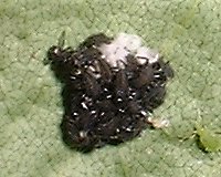 翌朝、もう既に卵からは 真っ黒い幼虫が・・・ 1〜2日は生まれた場所に じっとしています 初めての食事は遅く生まれた 兄弟です |