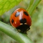 テントウムシといえばコレ♪ 赤地に黒星7つ・・・左右対称なので右、左に各3つずつ黒星があります そして前の方に左右にまたがって1つの黒星に見える模様があります |