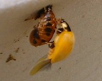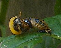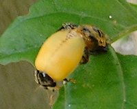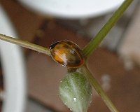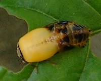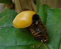| また、孵化直後のテントウムシは卵を食べることがよくあります 卵はとても栄養が豊富で、どうも幼虫はアブラムシよりも卵の方が好きなようです 1齢幼虫が2齢幼虫になるのにはアブラムシを25匹食べるという記録があります しかし、それがテントウムシの卵ならば1つ食べるだけで2齢幼虫になれるそうです しかも、アブラムシを食べた1齢幼虫よりも早く成長するのです 卵を食べる性質・・・それはエサが不足しない為の自然のしくみに違いありません |