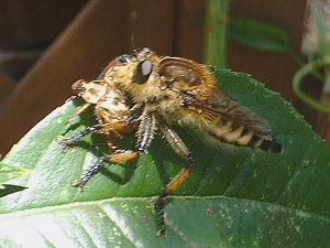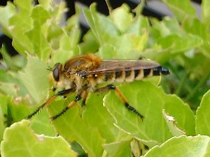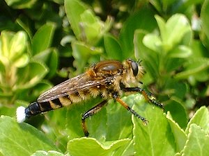 | 夏の日射しが照りつける毎日・・・ 最近、毎朝、このムシを見かけます。その名はシオヤアブ! ハエやアブの仲間にしてはスマートな体型をしています もちろん、動きも敏捷そのもの!! |