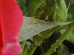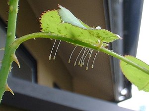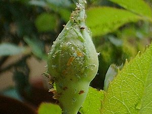 ![]() 蕾にウジャウジャアブラムシ・・・ でもそのアブラムシを感知してクサカゲロウの お母さんが卵を産み付けてくれています |