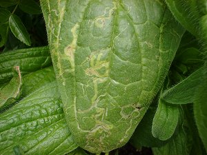 | 葉肉の中に2〜3oの小さなウジムシがもぐり、組織を食べながら移動します その食い後が模様になるのです よく、見てみると幼虫がいる場所が透けて見えますね・・・ ひどいときには葉肉が全部食べられて真っ白になり枯れてしまうこともあるそうです しかし・・・我が家では一度も枯れたことはありません(^^ゞ |