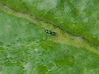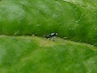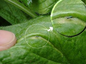 | 「ハモグリバエ、たくさんいるなぁ〜〜やれやれ(-_-;)」と思ってみていると・・・ 2〜3oくらいの緑色した光沢のある小さな虫が目に付きました 何やら行ったり来たりしています |