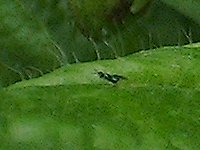 | どうやら葉の中のハモグリバエの幼虫を探しているようです そして見つけると・・・お尻の産卵管をハモグリバエに立てています この虫はどうやら寄生バチor寄生バエのようです どんな小さな虫にでもちゃんと天敵はいるものですね! |