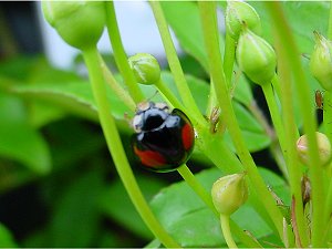 ![]() アブラムシの天敵のテントウムシも 健在です 黒地に赤の模様のナミテントウです |