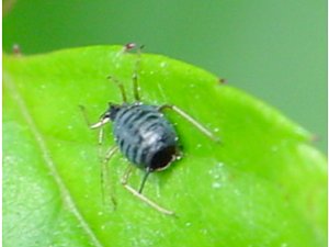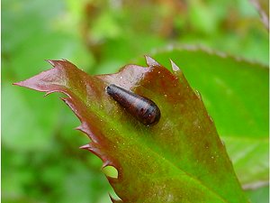| お馴染みのヒラタアブの幼虫です。卵から孵ったばかりの幼虫は数ミリです。 すごい食欲であっという間にアブラムシを平らげていきます。 アブラムシの体液を吸い尽くします。干からびたようなアブラムシの死骸ががたくさんあるときは きっと、この幼虫が大活躍しているはずです。 左側の幼虫はゴツゴツした体つきをしてます・・・蛹になる日も近いようです。 |