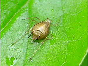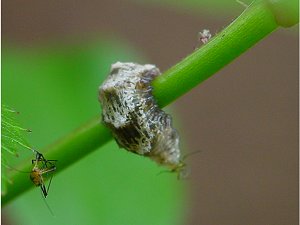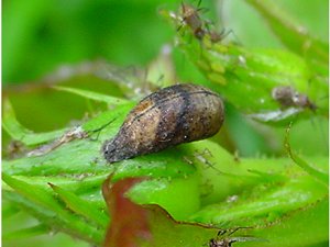 | アブラムシのマミー(ミイラ)です。 小さなハチ(アブラバチ)に寄生されたアブラムシの体は色を変え、風船のように膨れ上がります。 ハチの種類によってマミーの色も変わるようです。 右側の黒いアブラムシのお尻には、穴があいています。 これは、アブラバチすでに成虫になってアブラムシの体内から抜け出た跡です。 |