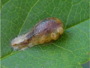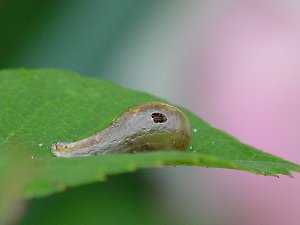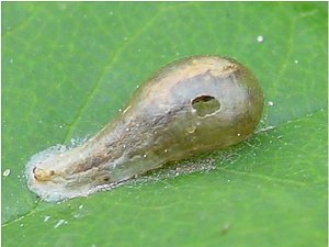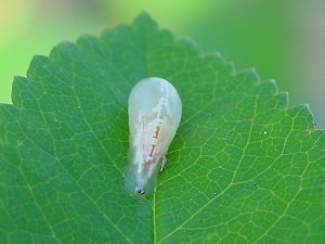 蛹になりたてのヒラタアブ とてもきれいな乳白色の蛹です 背中の模様が、幼虫の面影を残してますね・・・ |