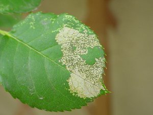 バラの葉の裏を見ると・・・ この通り! 小さいうちは集団で食害し、 大きくなると単独で行動するようになります |