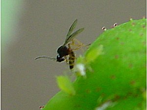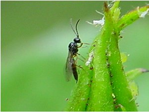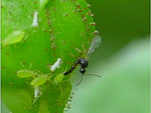 | アブラバチは長い時間、同じ場所にとどまって、そこにいるアブラムシに片っ端から産卵していきます | |