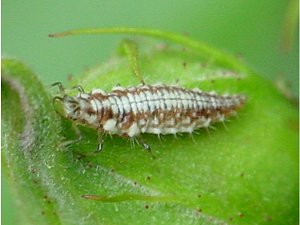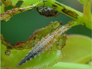 ![]() 立派な?クサカゲロウの幼虫 鋭い顎でアブラムシを掴み 体液を吸い取ります |