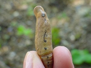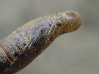| 10月18日 花壇を整えていると、土の植えにゴロンといました、蛹・・・ くるんと丸まった口、薄っすらと見える目、シンメトリーな模様 スズメガの蛹 |