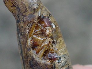ぽっかりと開いた穴からは、 出来上がった足やカラダが覗いていました。 まだ生きてる?? 羽化する可能性はあるんだろうか? |