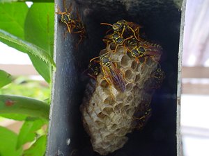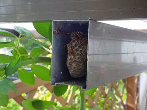| 春から花壇横の物干しの屋根の隙間にせっせとアシナガバチが入っていっていました。 めっきり大人しくなってしまった秋・・・いい機会です。 開けてみる事にしました。 |