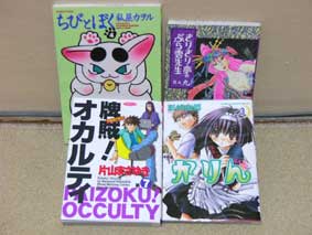 ちびとぼく 4巻 これ読むたびに猫が飼いたくなります、そう郵貯の男のように。 最近近所で子猫を2匹連れた母猫がうろついているので捕獲したいのですがしたところで父親が 駄目だと言うので、というか今甥っ子がまだこちらにいるので無理なんですよね。 一人暮らししたら飼っていく余裕が時間的にも金銭的にもないと思うので実家にいる間に 飼っておきたいですな。 きりきり亭のぶら雲先生 9巻 今回は夏の日本海がメイン。 これを読んで初めて知ったのですが夏の日本海だと岩ガキが旬なんですね。 今まで冬場だけだとばかり思っていたので意外でした。 是非一度食べてみたい物です・・・来年の3月あたりにまた友達と旅行に行きたいな〜、今度は 当然冬のカキを食べに広島ですな、げへへ(前回、一昨年は温泉に入って蟹を食べに城崎へ行きました) で、漫画の方なんですが、おせんと同じように日本の伝統的な味や文化について語っているのですが こちらはちょっと・・・いやかなり下品なネタが多いんですよね〜。 これが無かったらいい話だったのに、というのが多いです。 まあこちらはこれが売りなんでしょうかね・・・ 牌賊!オカルティ 7巻 ついに最終巻、最後に勝つのは、デジタルかオカルトか、それとも打撃系か? 結局すべてのシステムは出てきませんでしたが、同時発売のオカルト戦術の本だと 全部書いているそうなので気になる人はそちらをどうぞ。 漫画とは関係無いのですが最近20半莊くらいノートップだったり、それどころか大半は ラスというさんざんな状態です。 何というか、もう全然ついてないです。 で、そんなときでもほんのたまに良いのが来るのですが馬鹿なミスで失敗したり。 制限時間があると焦ってしまうのをどうにかしないとな〜。 かりん 3巻 いつの間にか出てました。 そのせいでとらのあなであったサイン会も逃してたよ_| ̄|◯ 内容はラブコメ色が強くなってきたのですが、エチィなカホリも強くなってきた気が。 まあ、なんですね、番外編で出てきた寺西タン(11)(;´Д`)ハァハァという事で。