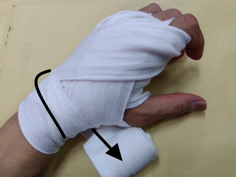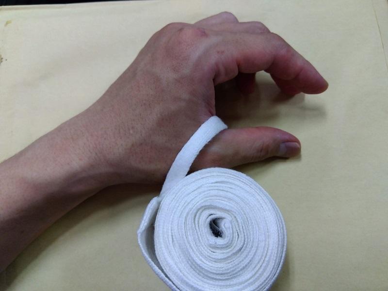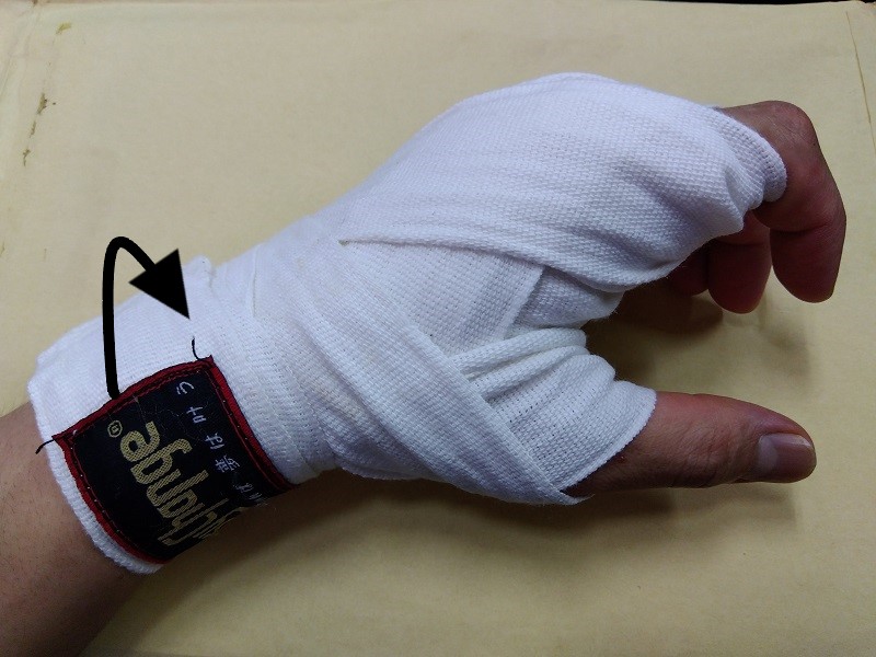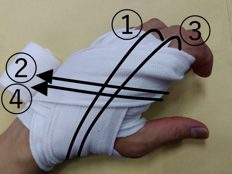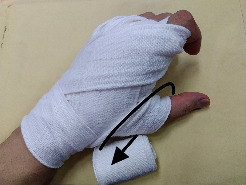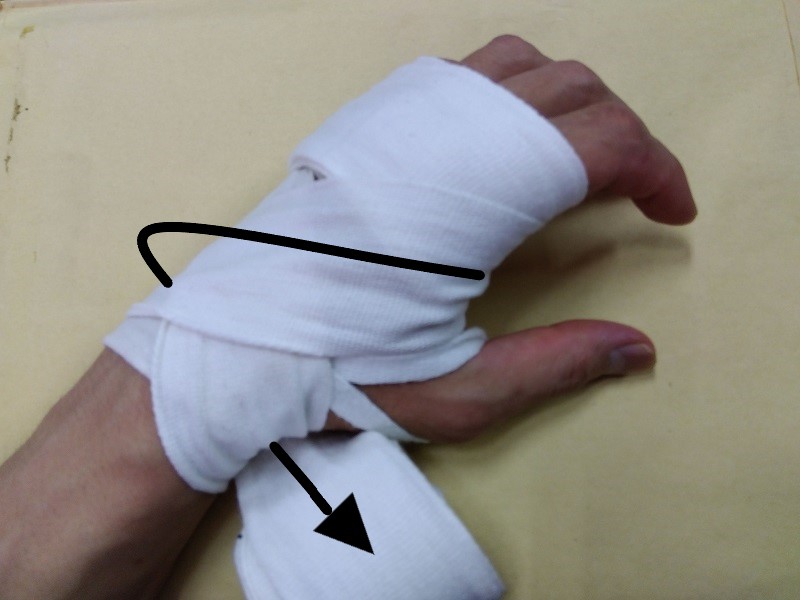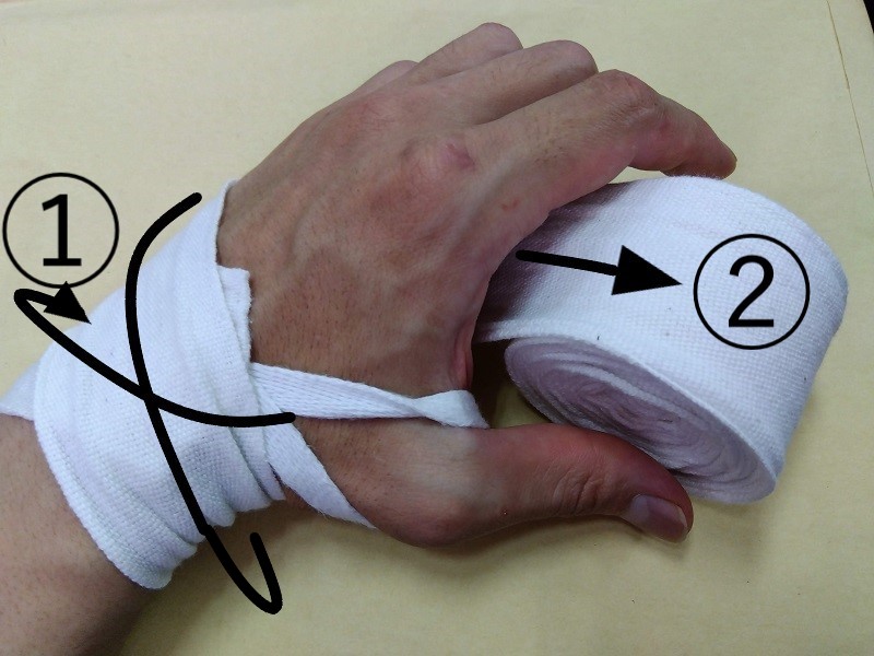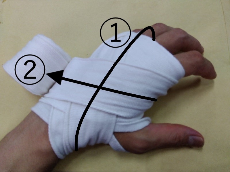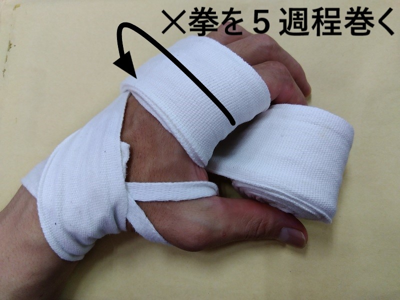 ![]() 【1】バンテージの輪の方を「親指」に掛ける ![]() 【2】手首を経由して、拳を巻ける状態にする ![]() 【3】拳を5周程巻く ![]() 【4】手首に戻る ![]() 【5】上から@「小指と薬指の間」、裏からA「人差し指と親指の間」を通して、手の甲でクロスする ![]() 【6】同じ要領で、@〜A「薬指と中指の間」、B〜C「中指と人差し指の間」を通して、手の甲でクロスする ![]() 7・手首を1周巻く ![]() 8・親指も1周巻く(上から) ![]() 9・手首を内から外に巻いてマジックテープで止める ![]() ※巻き方自体はこれに限らず、色々な巻き方があるので、各自工夫したり、オリジナルな巻き方でも結構です。 拳と手首が保護でき、トレーニング中にほどけない 巻き方であれば、OKです。 他には、下記のように拳の上で折り返すのも有り↓