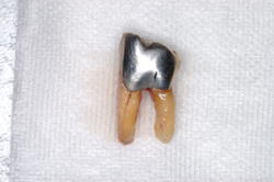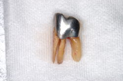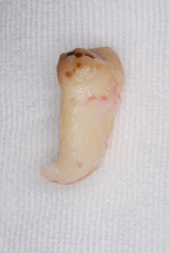 | 抜いた親知らずです。智歯ともいいますが、正式な名称は第3大臼歯と言います。根の先が90度も曲がっていましたので、折れないように抜くのが大変でした。骨は硬くて剛体の様に見えますが、実は少し弾性があり変形します。ちょうど若木の様な感じです。それ故に、この様に曲がった歯も抜く事ができるのです。 | ![]() |