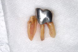 | 歯根破折の症例です。時々歯肉が腫れて痛む、咬むと痛いという症状があります。虫歯も無いのにおかしいなと思ったら、歯が割れていたなんて事があります。レントゲン写真で分かる場合もありますが、抜歯して初めて分かる場合もあります。元々健康な歯でも割れる事もありますので、硬い食べ物には気を付けましょう。 | ![]() ![]() ![]() ![]() |