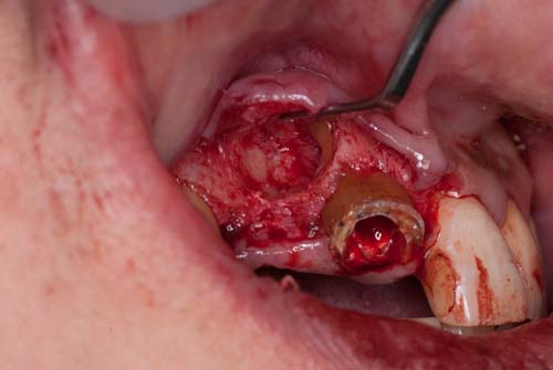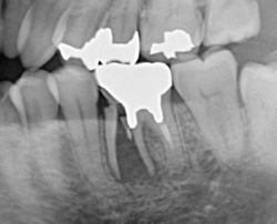 | この症例は、歯根嚢胞という物です。袋状の病巣で中に滲出液が溜まります。歯の中に入り込んだ細菌が原因でできるのですが、骨が溶かされて穴が開きます。根の消毒だけでは治らない場合は、外科的に摘出をします。 | ![]() |