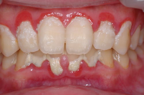 | これは重度の歯肉炎です。原因は多量の歯垢。ほとんど歯磨きをしていないと思われます。歯垢に触れている歯肉が赤くなっているのが分かりますか?炎症が起きており、少し触っただけで血膿が出、口臭もひどいです。歯肉がだいぶ弱っていますので、一番軟かい歯ブラシを使って歯垢を取ってください。歯肉のマッサージも少しずつやらないと健康な硬い歯肉には戻りません。 頑張ってください。 |