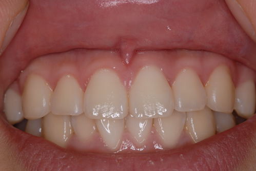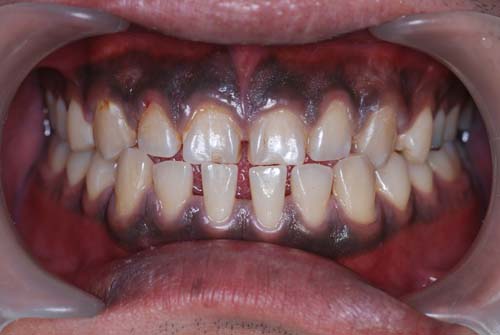 | こちらの歯肉は黒いです。歯周病、歯肉炎は無いのですが、真っ黒です。喫煙者の歯肉ですが、タバコのヤニが直接沈着するのではなく、ニコチンやタールの刺激でメラニン色素が沈着するのです。いくら歯磨きをしても取れません。タバコを止めれば徐々に治っていきますが、かなり時間が掛かると思います。喫煙者は歯周病にも罹患しやすいので、タバコは止めるに越した事はありません。 | ![]() |